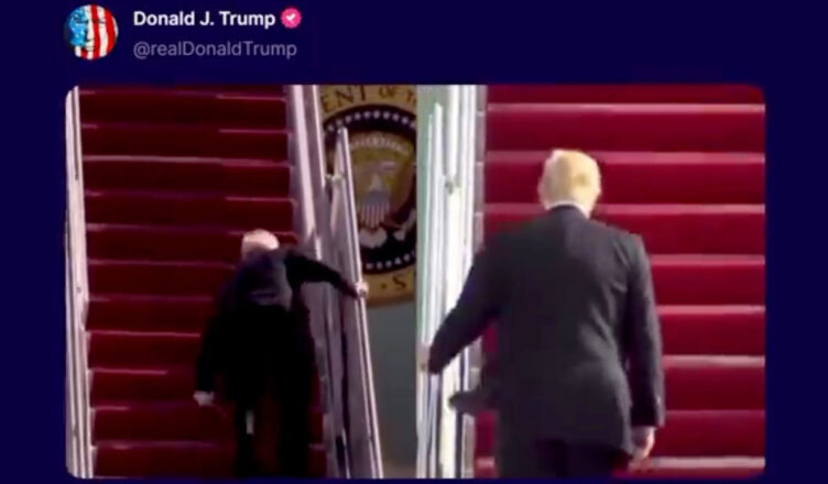 Las imágenes muestran el momento cuando Biden tropezó varias veces y luego cayó de rodillas mientras subía la escalera del Air Force One. Trump, por su parte, aparece abordando la aeronave sin perder el equilibrio.