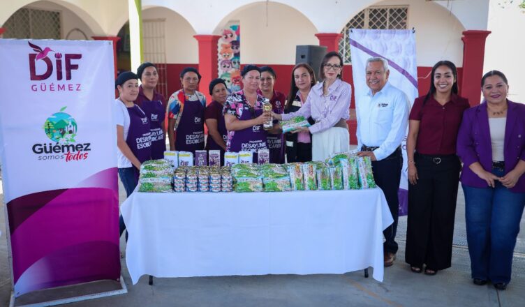 Güémez, Tamaulipas.- El Sistema para el Desarrollo Integral de la Familia de Tamaulipas que preside la doctora María de Villarreal, realizó la entrega simbólica de insumos alimentarios que enmarcaron el arranque del programa Desayunos Escolares para el ciclo escolar 2025-2026.